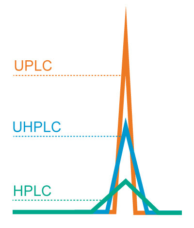 - UHPLC [Ultra High Performance Liquid Chromatography] generalmente tienen una dispersión de columna extra entre 12 - 30 µL, y están optimizados para ejecutar columnas empacadas en 3.0 mm I.D. con partículas no menores a 2.5 µm. La presión de funcionamiento típica suele oscilar entre 6.000 y 15.000 PSI, y el caudal suele ser inferior a 2,0 mL/min. Las características de dispersión, presión y caudal de estos sistemas los hacen idóneos para las modernas columnas de núcleo sólido de 2,7 µm.