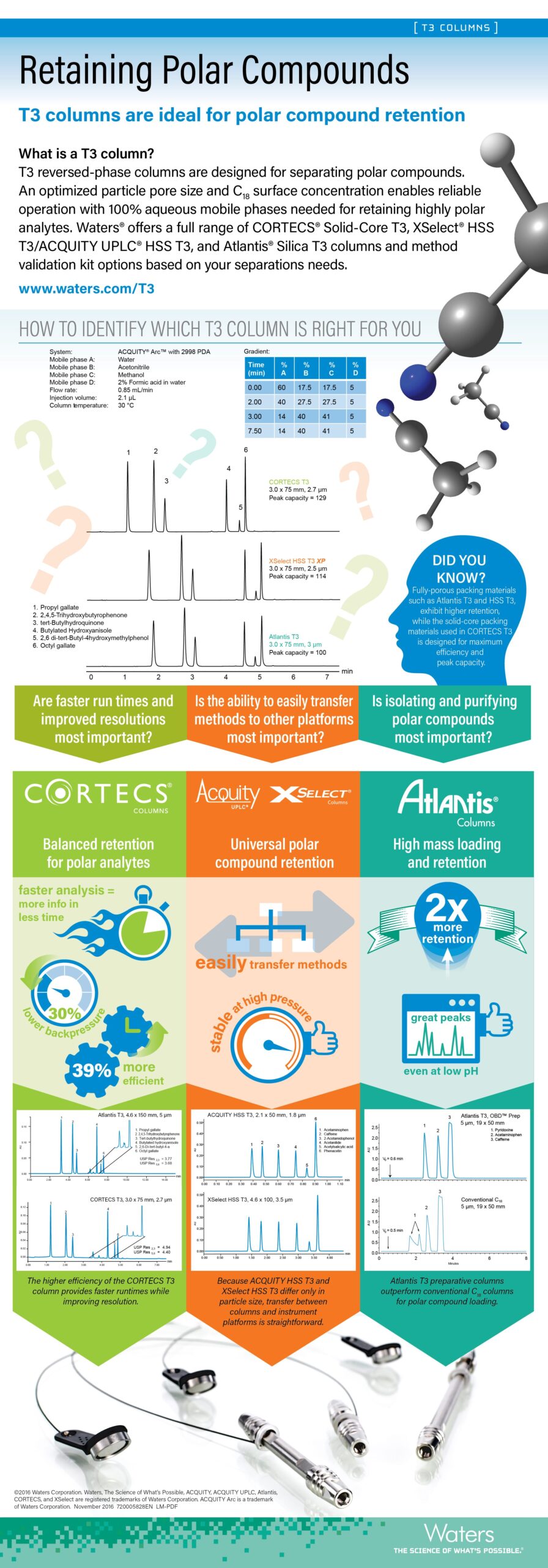 Disponibles en tres fases estacionarias basadas en sustratos de partículas únicos, las columnas CORTECS Solid-Core T3, ACQUITY UPLC/XSelect HPLC HSS T3 y Atlantis silica T3 proporcionan una mayor retención de compuestos polares y una mayor vida útil de la columna en separaciones en fase inversa.