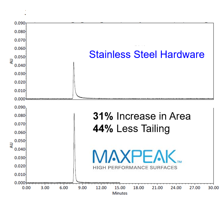 Pour résoudre le problème des pertes d'absorption des analytes acides par l'acier inoxydable, une nouvelle technologie devait être inventée. Les surfaces à haute performance MaxPeak (HPS) ont été conçues pour augmenter la récupération des analytes, la sensibilité et la reproductibilité en minimisant les interactions analyte/surface. Cette technologie résout les problèmes couramment rencontrés avec les analytes acides interagissant avec le matériel de colonne en acier inoxydable sans sacrifier les avantages de l'acier inoxydable, l'un des avantages étant la capacité de fonctionner à des pressions plus élevées.