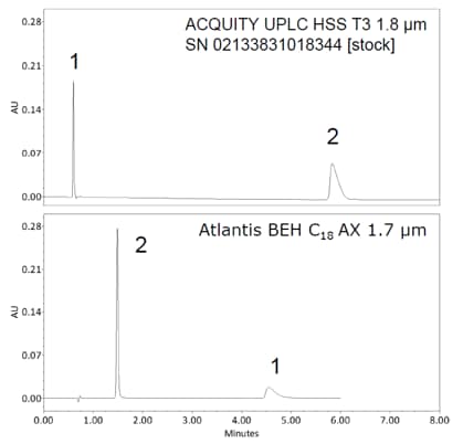 La figure 1 montre la rétention et la séparation de l'antihistaminique Chlorpheniramine Maleate sur une colonne en phase inverse C18 conçue pour retenir les analytes polaires, et sur une colonne échangeuse d'anions RP à mode mixte. La colonne C18 retient bien l'analyte hydrophobe basique Chlorpheniramine mais ne peut pas retenir l'analyte polaire acide Maleate. Le maléate, un petit acide polaire, n'est pas retenu sur cette colonne, et élue dans le vide. La colonne mixte RP/échange d'anions retient bien les deux analytes. Même en changeant l'ordre d'élution, la chlorphéniramine est retenue par les interactions RP, et l'analyte acide polaire maléate est retenu par l'échange d'anions.