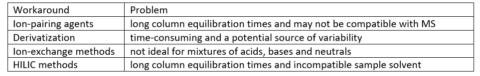 Les acides polaires présentent un ensemble de problèmes spécifiques qui les rendent particulièrement difficiles à retenir dans des conditions de chromatographie en phase inversée. Les silanols ionisés qui sont présents créent une charge négative à la surface de la phase stationnaire qui repousse les acides ionisés, chargés négativement. Il existe quelques solutions de contournement que les scientifiques peuvent utiliser pour retenir les acides polaires sur une colonne à phase inversée, mais elles ajoutent souvent une autre couche de complexité et de variabilité potentielle à leurs flux de travail. Certaines des "solutions de contournement" les plus courantes sont énumérées ici avec les problèmes qu'elles posent :