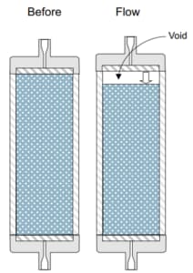 This commonly creates a void in the stationary phase at the column inlet resulting in distorted peak shape and in extreme cases split peaks.