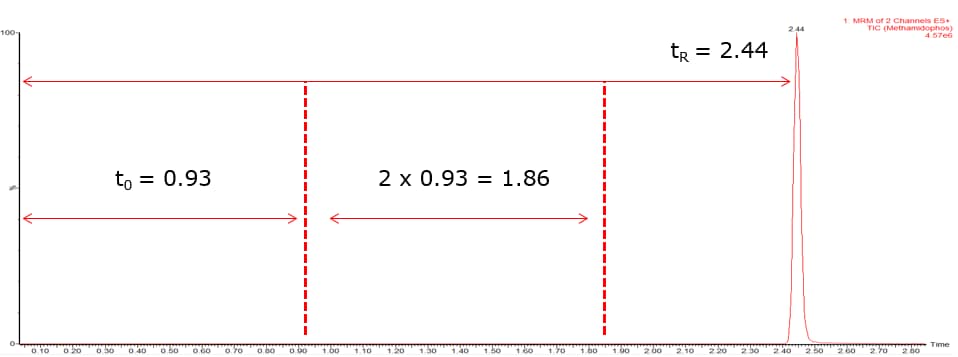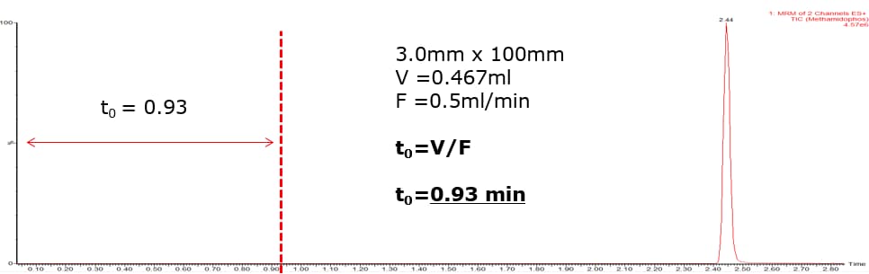 - Flow rate is 0.2 mL/min so t0 is 0.57 minutes (2 x t0 =1.14 min)