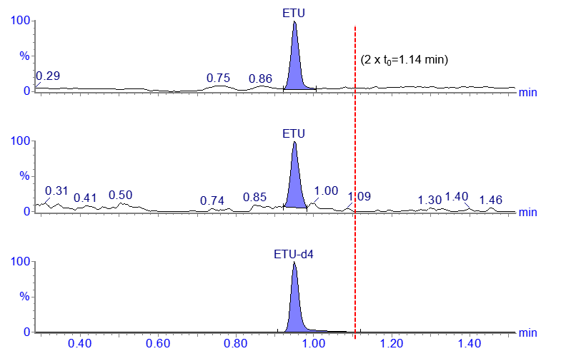 The retention time for ETU in this case is less than twice the column void time (t0) with the mobile phase conditions that have been used.