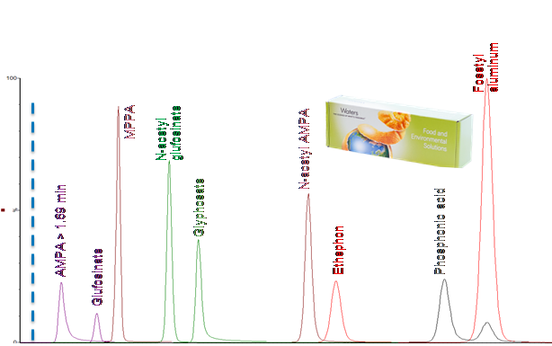 Under these conditions4, using a 2.1 mm x 100 mm APP column with a flow rate of 0.5 mL/min, t0 is 0.46 minutes, so the RT for AMPA, the first peak to elute, is 3.5 x t0, well within the SANTE guidelines.