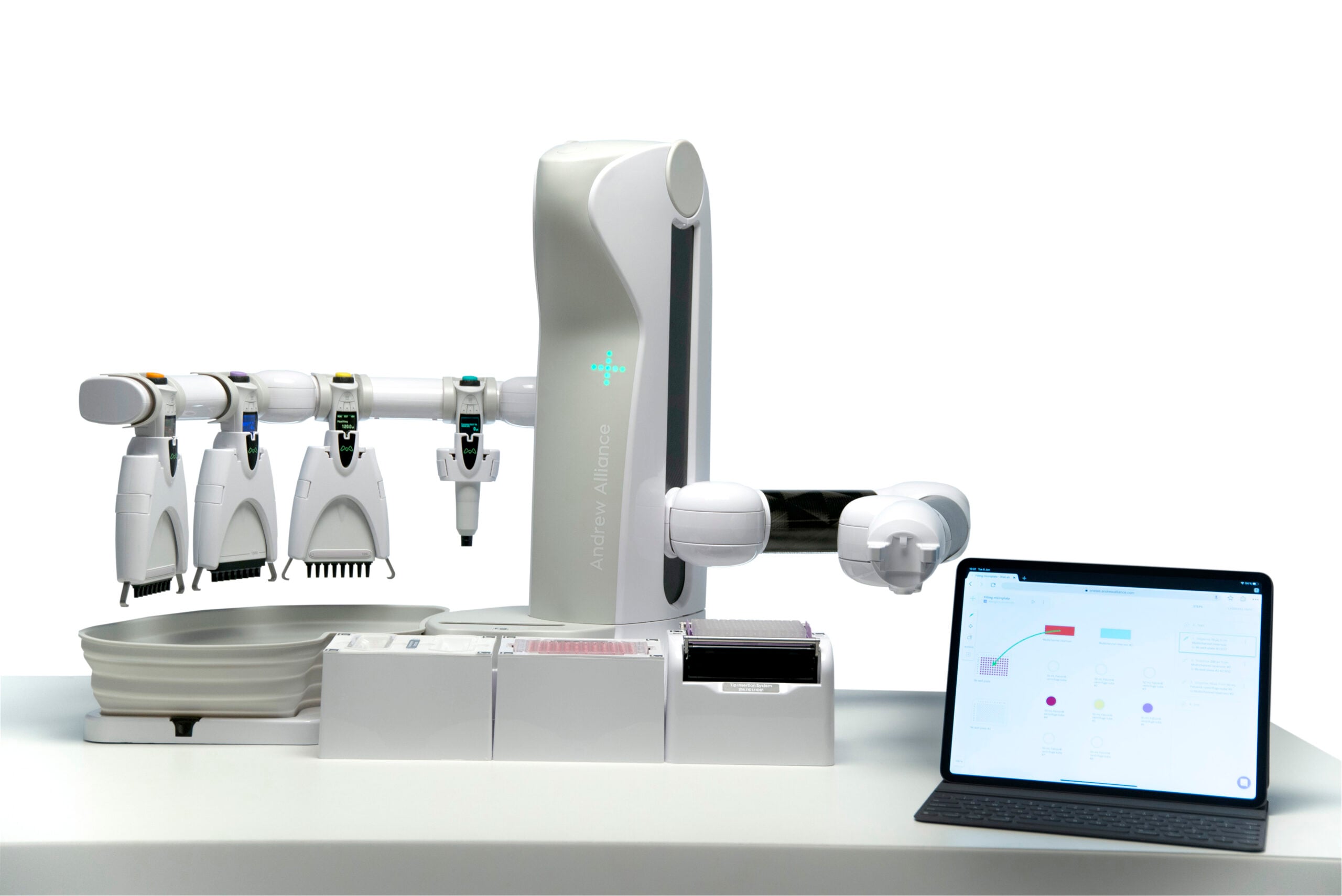 The Andrew Alliance portfolio includes the Pipette+, the Andrew+ liquid handling robot, supported by additional connected devices and tools, and OneLab, an intuitive cloud-native software that enables fast, flexible and traceable sample preparation capability.