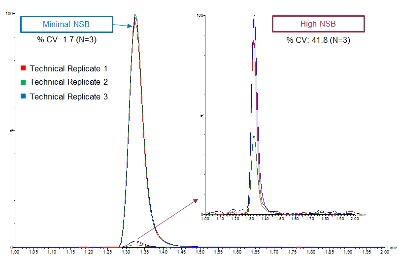 Peptides and proteins are especially prone to non-specific binding (NSB) or adsorption to solid surfaces. These surfaces could be pipette tips, sample storage containers, or injection needles. Now, we all know ways to mitigate adsorption, like: