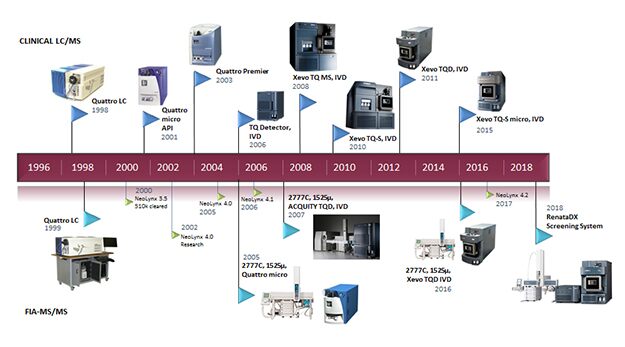在过去的20年里,沃特世为全球的临床科学家提供了分析能力。用于临床的三重四极杆质谱仪一直在不断发展,从早期的Quattro LC的研究用途到ACQUITY TQ检测器的体外诊断(IVD)能力再到Xevo TQ-S微型质谱仪。自20世纪90年代末以来的这种 "扩展演变"--部分是我们对 "Xevo "名称本身的启发--已经与FIA-MS/MS诊断筛查应用的系统部署的有目的的创新相匹配。