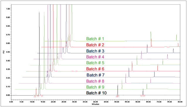 10个不同批次的XBridge BEH C18柱上描述的USP方法的色谱图。保留顺序为杂质A、罗苏伐他汀、杂质B和C。