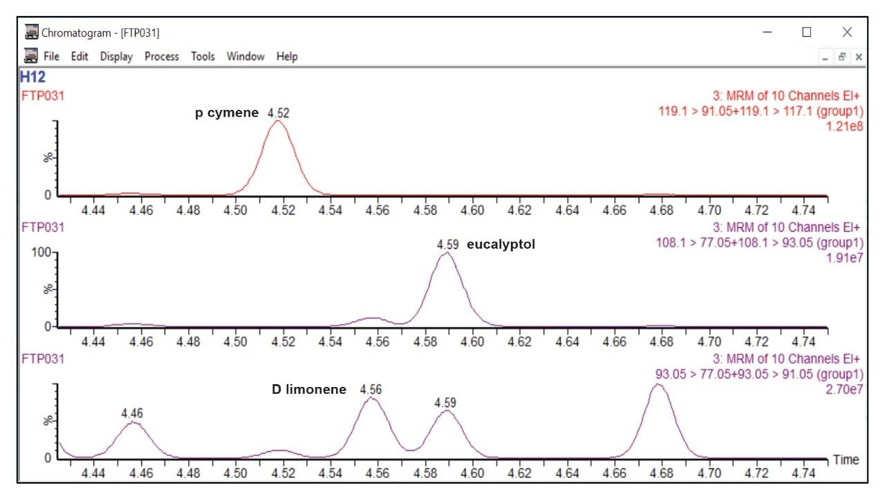 Figure 5 is an example of the evaluation of ion ratios of two closely eluting analytes in the TargetLynx XS browser. Each analyte has very different ion ratios between the three MRM transitions. The acquisition of multiple MRM transitions common to many of the potential monoterpenes eluting within the same retention time range allows more definitive assignment of the correct identification and also facilitates the addition of compounds in this class to the analysis.