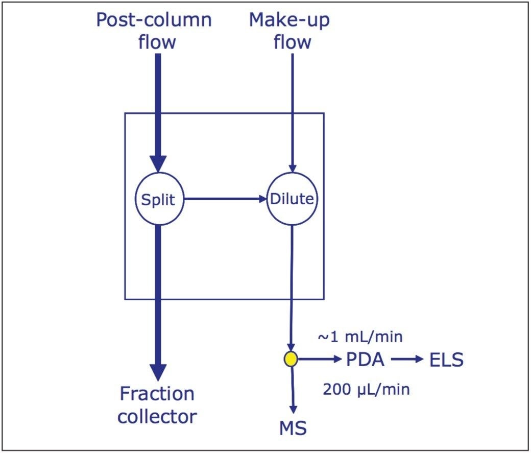 Special consideration must be given to detection in preparative chromatography. The highly concentrated peaks exceed the linear range of common detectors. In addition, the high flow rates are not tolerated by detector hardware. Finally, some detectors used in this study (MS and evaporative light scattering) are destructive. It is, therefore, necessary to use a technique that reduces the flow and concentration reaching the detectors while minimizing loss of desirable material. A passive splitter is commonly used in the high ratio split and dilute technique, as shown in Figure 2.