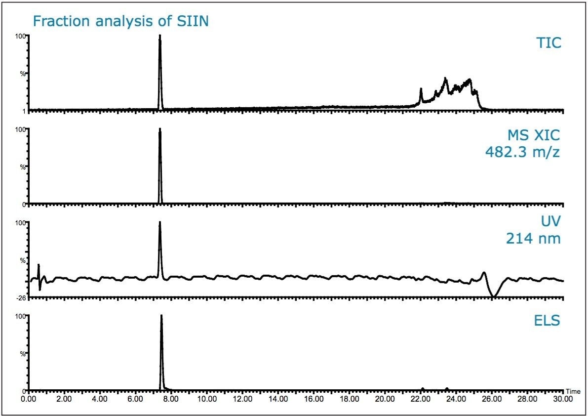 The fractions resulting from the preparative runs are analyzed to assess purity. Multiple detection channels are used to monitor the analysis to provide more complete characterization of the fractions. The fraction analysis of both ISQA and SIIN peptides use the separation conditions in Table 7. The results of the fraction analysis are shown for ISQA and SIIN in Figures 8 and 9, respectively.