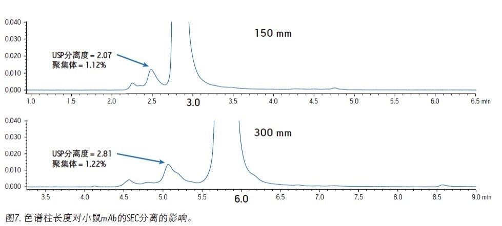 另外,我们还在4.6 x 150 mm以及4.6 x 300 mm色谱柱上使用小鼠mAb测试了色谱柱长度对SEC分离的影响。在相同的条件下,单体/二聚体在较长的色谱柱上能够实现更高的分离度(2.07 - 2.80)(图7),且聚集体量相当。分离度的改善还明显地体现在单体的峰拖尾上,300 mm色谱柱分离所得的峰拖尾上部分分离出了一个低分子量的小峰,而150 mm色谱柱分离所得的峰拖尾上则没有出现该峰。然而,伴随分离度改善的是保留时间的延长(从3.0 min延长至6.0 min)。