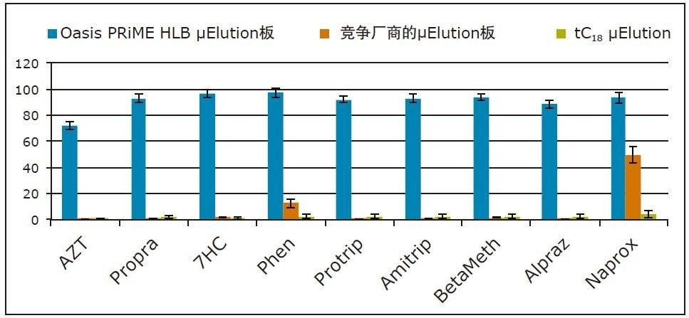 此前已有研究表明,仅当使用Oasis HLB等水可浸润性吸附剂时可以省略活化和平衡步骤。使用大部分类型的SPE吸附剂时,这些步骤是不能省略的。为证明这一点,我们比较了Oasis PRiME HLB、硅胶基质的C18吸附剂和竞争厂商的聚合物型吸附剂的回收率。本实验使用了μElution板和大鼠血浆样品。使用简化方案时,硅胶基质C18吸附剂和竞争厂商的吸附剂获得的回收率极低(图2)。相反,采用这种3步法时,Oasis PRiME HLB吸附剂表现出色,这表明非水可浸润或部分水可浸润性吸附剂(包括聚合物型吸附剂)在研究中均不适用于简化的样品前处理方案(有关详细信息,请参阅应用纪要720005140EN)。为了客观地比较不同吸附剂对合成大麻素的萃取性能,我们对Oasis PRiME HLB应用了3步法,而对其它SPE产品应用了5步法。