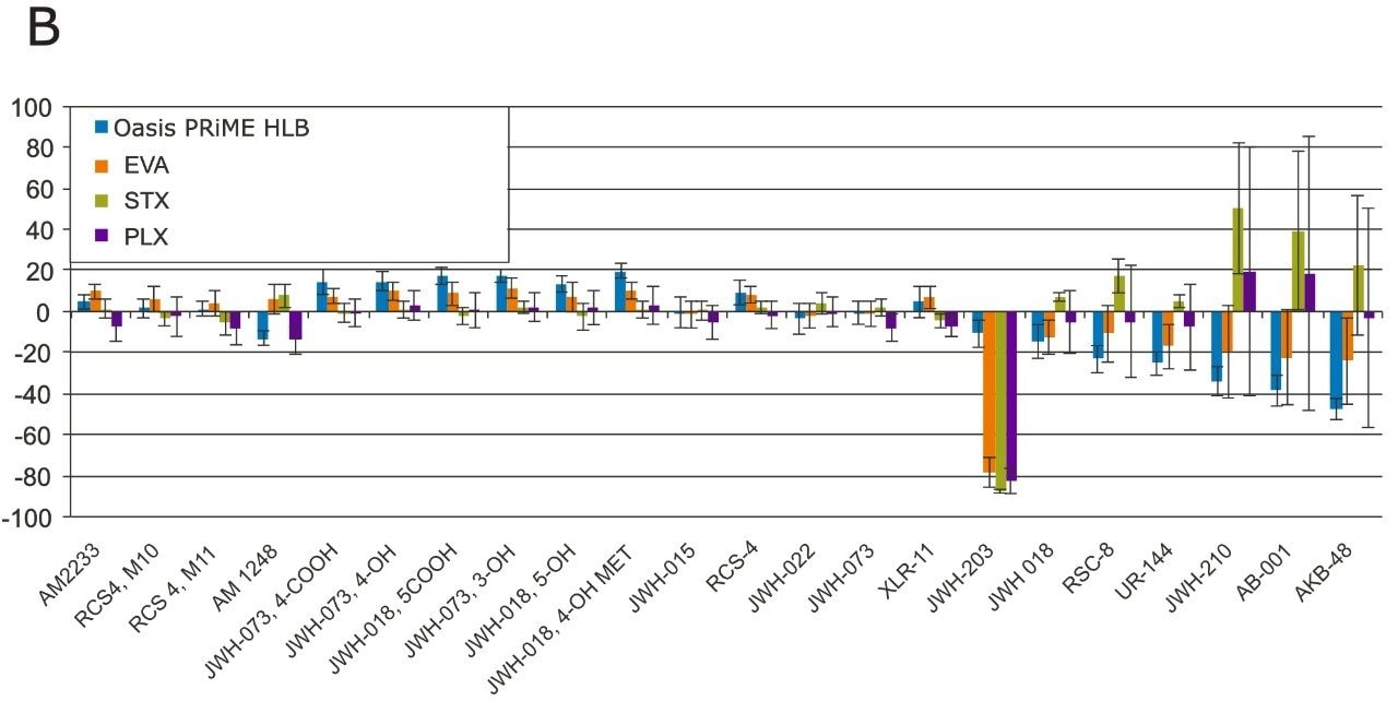 本应用纪要中的合成大麻素及其代谢物包含中性、酸性和碱性化合物。使用反相吸附剂能够同时提取所有待测化合物及其代谢物,无论它们带有何种官能团。根据“实验”部分描述的公式,我们计算了Oasis PRiME HLB和竞争厂商的反相SPE产品对所有被测化合物的回收率,结果如图4a和表3所示。对于Oasis PRiME HLB,22种化合物中有21种化合物的回收率在90–110%之间(AM2233的回收率为71%),所有%RSD均在3–7%之间。竞争厂商的反相产品的回收率则要低得多,总体的偏差也更高。竞争产品“EVA”的回收率在60–97%范围内,%RSD范围为1–17%;竞争产品“STX”的回收率在59–92%范围内,%RSD范围为2–27%;竞争产品“PLX”的回收率在46–84%范围内,%RSD范围为3–41%。对于最后7种分析物(JWH-203、JWH-018、RSC-8、UR-144、JWH-210、AB-001和AKB-48),所有竞争厂商的SPE产品的%RSD都高于可接受范围(EVA的%RSD高达17%,STX高达27%,而PLX则高达41%),因此无法确保可靠的定量分析。相反,合成大麻素的高回收率和低%RSD结果表明,使用Oasis PRiME HLB通过简单的上样-清洗-洗脱方案分析其它类似化合物时应该也能获得类似的结果。