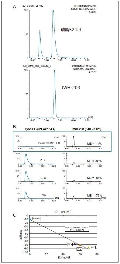 这清楚地表明,采用竞争厂商的SPE产品得到的提取物中存在着严重的干扰。磷脂分析结果表明,JWH-203与残留磷脂溶血磷脂酰胆碱18:0 (m/z 524.4)共洗脱,竞争厂商的SPE产品未能去除这种磷脂。从图5a中可以看到这种共洗脱现象。图5b展示了JWH-203与磷脂524.4共洗脱对JWH-203造成的离子抑制效应。图5c显示了磷脂的峰面积与该化合物受到的离子抑制效应之间的直接关系。以基质效应对相对磷脂丰度作图,通过该图所得的拟合线性回归曲线表明,这两个因子之间的相关性良好,R2值为0.987。