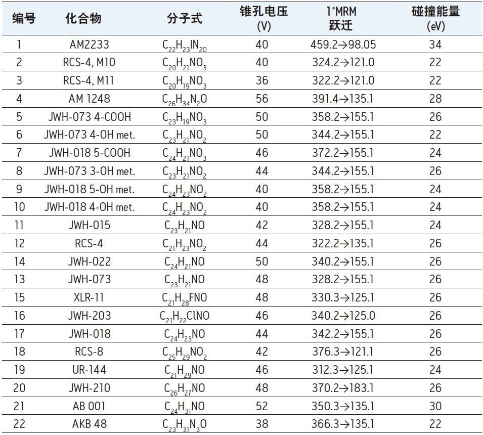本实验分析的22种化合物列于表2中,构成了一组包含各类法医毒理学相关合成大麻素的化合物。其中包括金刚烷甲酰吲哚类(AM 1248和AKB48)、萘甲酰吲哚类(JWH 022)、苯乙酰吲哚类(RCS-4和RCS-8)和四甲基环丙基吲哚类(UR-144和XLR11)。还包括JWH-073和JWH-018的主要代谢物,由于其中一些化合物为质谱碎片相同的结构异构体,因此对其准确定量需要达到足够的色谱分离。