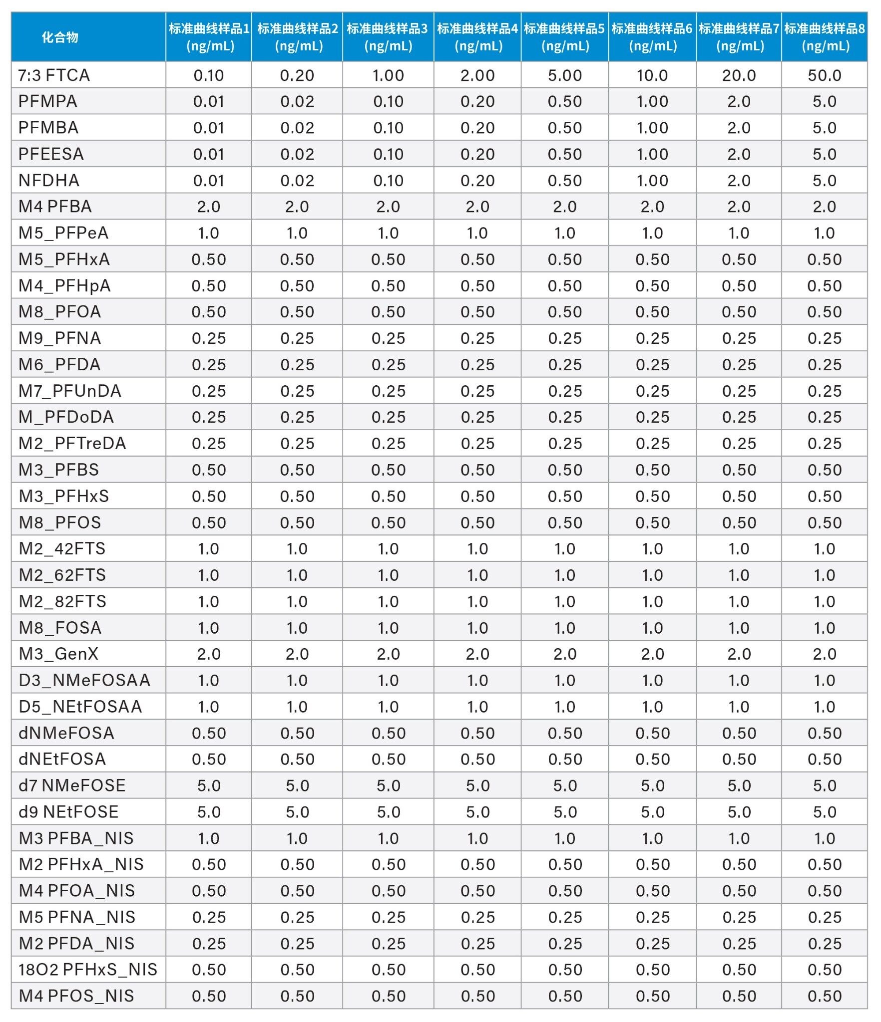 萃取前,向土壤样品中加标0.25~2 ng/g(样品浓度当量)的所需萃取内标(EIS),并在萃取后加标0.25~1.0 ng/g(样品浓度当量)的所需非萃取内标(NIS)。萃取前,向组织样品中加标0.625~5 ng/g(样品浓度当量)的所需萃取内标(EIS),并在萃取后加标0.625~2.5 ng/g(样品浓度当量)的所需非萃取内标(NIS)。单个组分的具体浓度的变化取决于Wellington混标中各组分的浓度。附录表2中列出了各分析物(样品瓶当量)的标准曲线范围,可根据本应用纪要第1部分中采集和展示的数据确定3。所有标准品(混合物)均购自Wellington Laboratories。