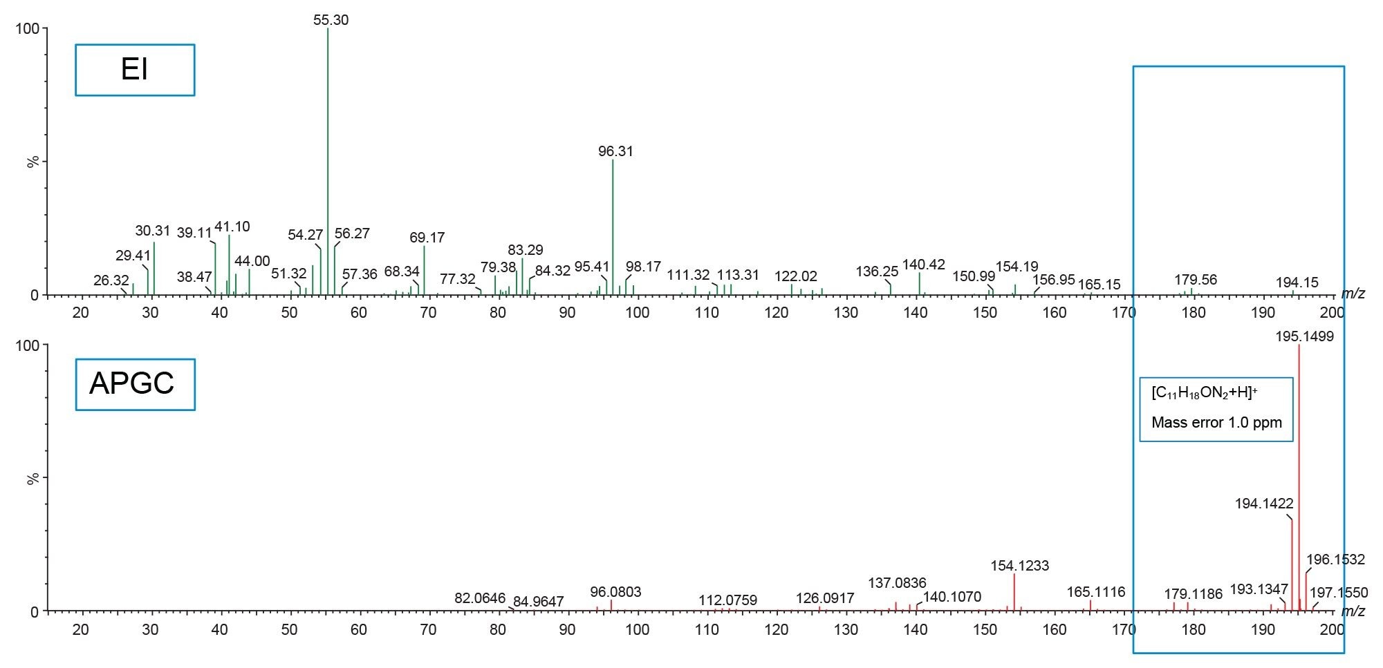 For some compounds, the use of the softer ionization of APGC results in the presence of the molecular ion, which is critical when detection and confirmation of the molecular ion is required. This is demonstrated here for the polymer, polycaproamide (Nylon 6). In Figure 3, a compound identified at m/z 194.2374, (assigned as N-(5-cyanopentyl)pent-4-enamide, C11H18ON2)2 was found in the APGC pyrogram with the protonated molecular ion present. The corresponding chromatographic peak in the EI pyrogram had the appropriate mass fragments but without the presence of the molecular ion.
