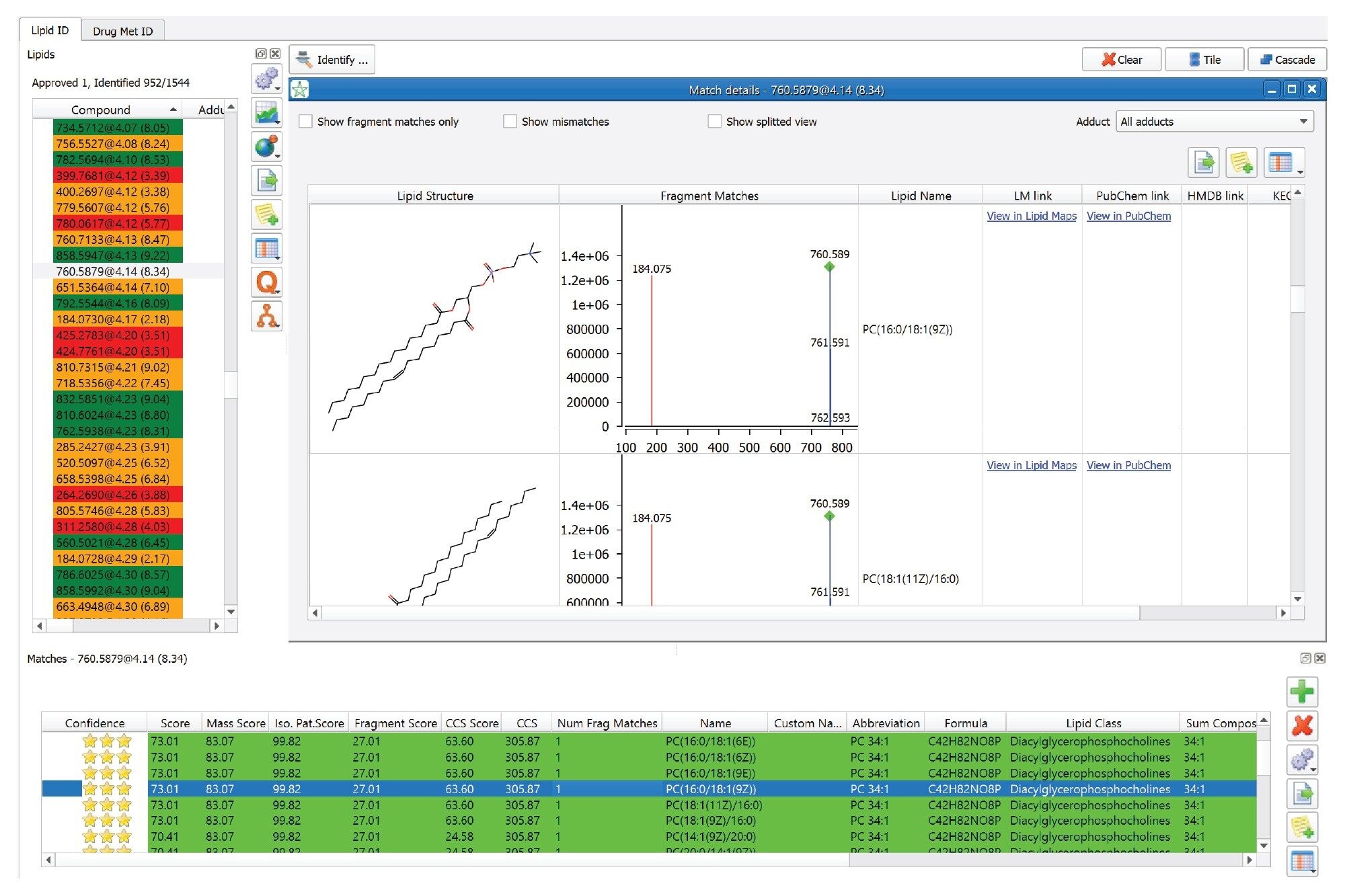 Il modulo DB Manager di Lipostar2 garantisce l’accuratezza con le regole di frammentazione specifiche della classe lipidica, riducendo al minimo il tasso di falsi positivi nel passaggio di identificazione. Gli strumenti intuitivi del software semplificano le analisi complesse per ottenere informazioni dettagliate, sfruttando risorse come LIPIDMAPS assieme alla semplice generazione di database personalizzati da file sdf o csv, inclusa la libreria Waters Lipidomics Profiling CCS. Lipostar2 assegna punteggi per errore di massa, pattern isotopico, frammentazioni e valori CCS, migliorando l’affidabilità dei risultati con un sistema a semaforo. I grafici di Kendrick sono inoltre disponibili per rivedere e ridurre ulteriormente il tasso di false discovery.