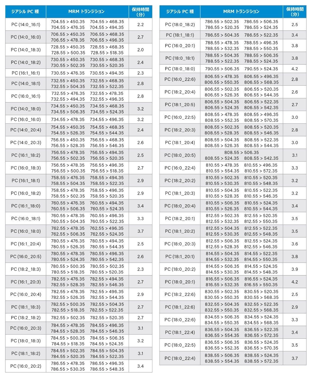 ジアシルホスファチジルコリン(ジアシル-PC)は、一連の MRM トランジションを使用して検出しました。ここで、プリカーサー質量とはプロトン化イオン [M + H]+ のものであり、プロダクトイオンは、2 つの脂肪酸残基のニュートラルロスか、アルキルケテンとしての脂肪酸のニュートラルロスにより、対応する 2 種の Lyso-PC のうち 1 つを切り離すフラグメント化のいずれかです(図 2 で例示されています)。表 1 に本分析法で測定できる 57 種のジアシル-PC のリストを示しています。この 4 つの MRM のアプローチにより、各 PC の脂質種の構造情報を解析できました。図 3 に、 2 つの脂肪酸に 36 個の炭素と 4 つの二重結合が含まれる 2 つのジアシル PC について取得したクロマトグラムを示します。図 3 は、異なる特異的 MRM トランジションだけでなく、PC(18:2_18:2) および PC(16:0_20:4) という最も一般的な 2 つの構造異性体もクロマトグラフィー分離されていることを示しています。