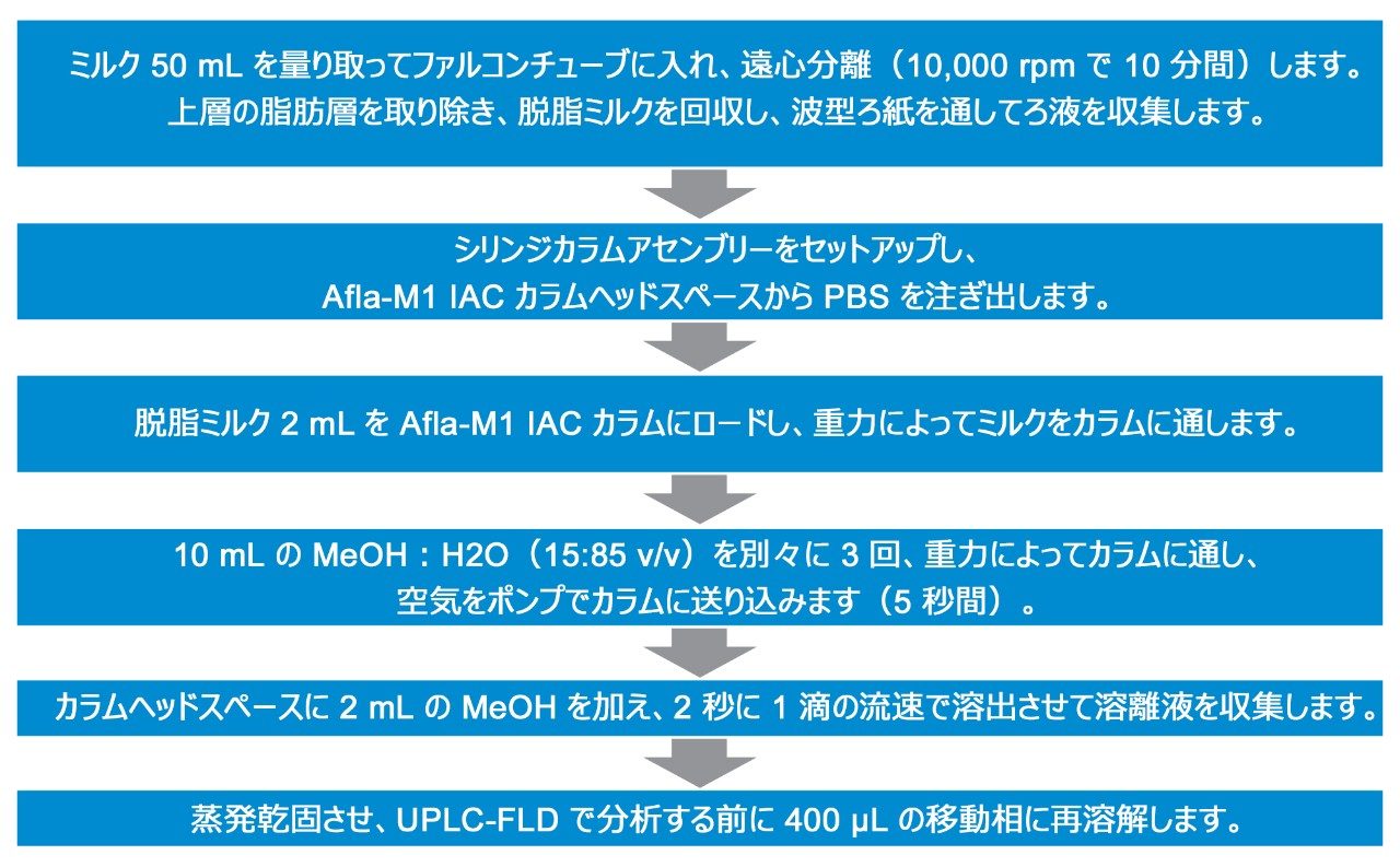 アフラトキシンのサンプル抽出およびクリーンアップの詳細の概要が、図 1 に示されています。試験サンプルは、水浴中で液状ミルクを温めた後、マグネチックスターラーでそっと撹拌して脂肪層を分散させてから、遠心分離して調製しました。上層の脂肪層を捨て、脱脂(スキム)ミルクをろ過してからさらに分析を行いました。元の AOAC 公定分析法では、50 mL のスキムミルクを試験に用いることが指定されていましたが、より感度の高い検出器と UPLC 装置を使用する新しい分析法では、必要なサンプル量はより少量であり、クリーンアップのステップにかかる時間が短縮されました。このスキムミルクの一部を、Afla-M1 LC IAC カラムに適用しました。AFM1 はカラム上で抗体に結合します。次にカラムを水とメタノールの混合液で洗浄してカラムから共抽出物を除去してから、メタノールで AFM1 を溶出しました。続いて、抽出物中の AFMI の測定を、FLD を装着した UPLC で行いました。Afla-M1 LC IAC カラムの使用の詳細については、こちらを参照してください。
