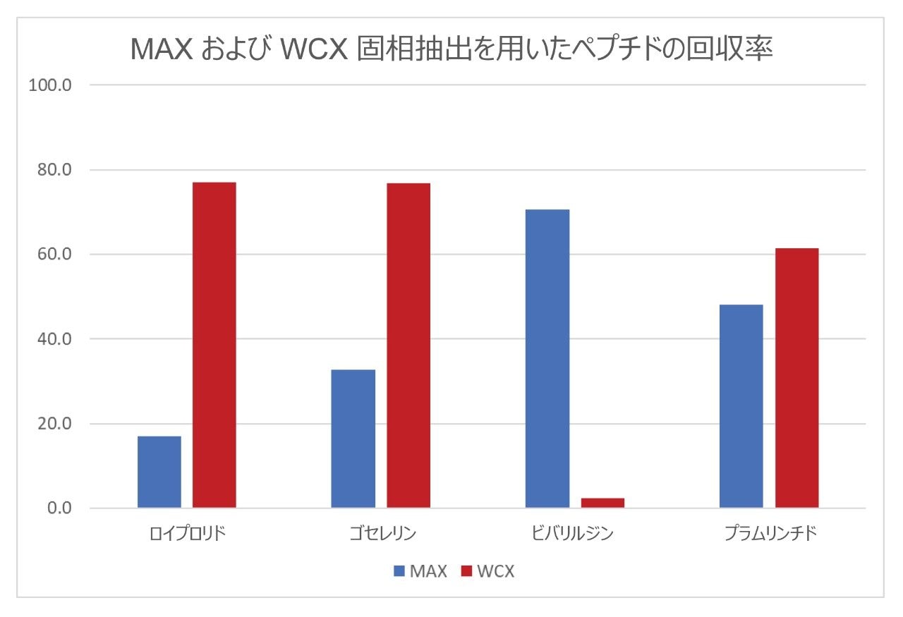 4 種類のペプチド医薬品(ロイプロリド、ゴセレリン、ビバリルジン、プラムリンチド)をニート溶液で調製し、Waters OASIS ペプチドセパレーションテクノロジー(PST)の固相抽出プロトコルを使用して、2 種類のイオン交換吸着剤(MAX および WCX)で抽出しました1。これらの陰イオンおよび陽イオン交換吸着剤は、ほとんどのペプチド医薬品および内因性ペプチドの固相抽出精製に適しています。ペプチドは各 50 ng/mL の混合物として調製し、リン酸を用いて酸性にしました。これらのペプチドの回収率を分析するために、固相抽出前または固相抽出後にサンプルをスパイクしました。PST 分析法開発 µElution SPE プレートをメタノールと水でコンディショニングし、酸性にしたサンプル(n=8)をロードしました。水酸化アンモニウムでサンプルを洗浄し、続いてアセトニトリル水溶液で洗浄してから、アセトニトリル、水、トリフルオロ酢酸の混合液で溶出しました。これらのペプチドの MAX および WCX の各吸着剤での回収率を図 1 に示します。表 1 に、2 つの異なる吸着剤を使用した場合のそれぞれの抽出の回収率および再現性を示します。各ペプチドについて選択した吸着剤を強調表示しています。これらの結果は、経験豊富な固相抽出ユーザーが加圧で行った以前の実験と一致しています。