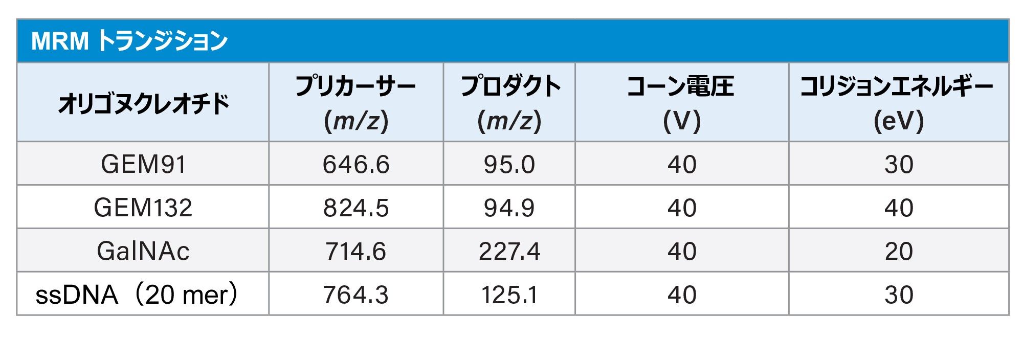 MS グレードのメタノール、水、アセトニトリル、イソプロパノール、ヘキサフルオロ-2-プロパノール(HFIP)、N,N-ジイソプロピルエチルアミン(DIPEA)、酢酸アンモニウムは Sigma Aldrich(米国、ミズーリ州セントルイス)から購入しました。K2 EDTA ラット血漿は BioIVT(米国、ニューヨーク州ウェストバリー)から入手しました。DNase/RNase フリー蒸留水は、ThermoFisher Scientific から購入し(製品番号: 10977015)、オリゴヌクレオチド標準試料の調製および SPE サンプル溶出液の希釈に使用しました。OligoWorks キット(製品番号:186010614)はウォーターズコーポレーション(米国、マサチューセッツ州ミルフォード)から入手しました。