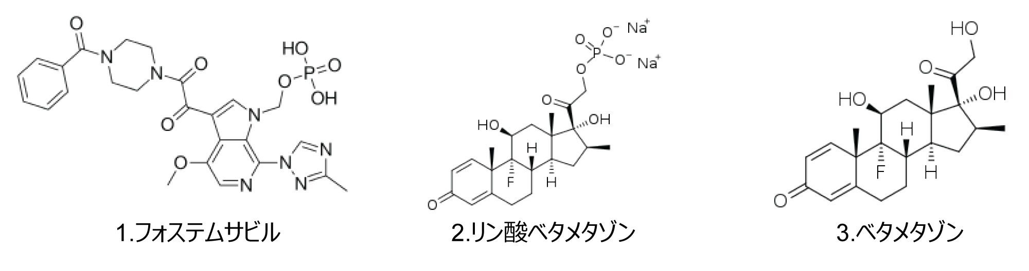 1)フォステムサビル、2)リン酸ベタメタゾン、3)ベタメタゾン。