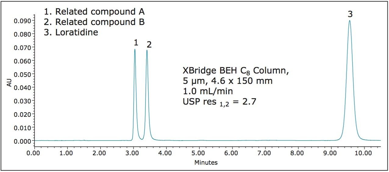 The original USP monograph for the analysis of loratidine impurities is performed on a 4.6 mm x 150 mm, 5 μm L7 column, which is a column with a C8 ligand. To be consistent with the USP monograph an XBridge BEH C8 Column, 5 μm, 4.6 x 150 mm (p/n 186003017), was used to separate the analytes on an ACQUITY UPLC H-Class System. Figure 2 shows the chromatogram of the separation on the XBridge BEH Column.
