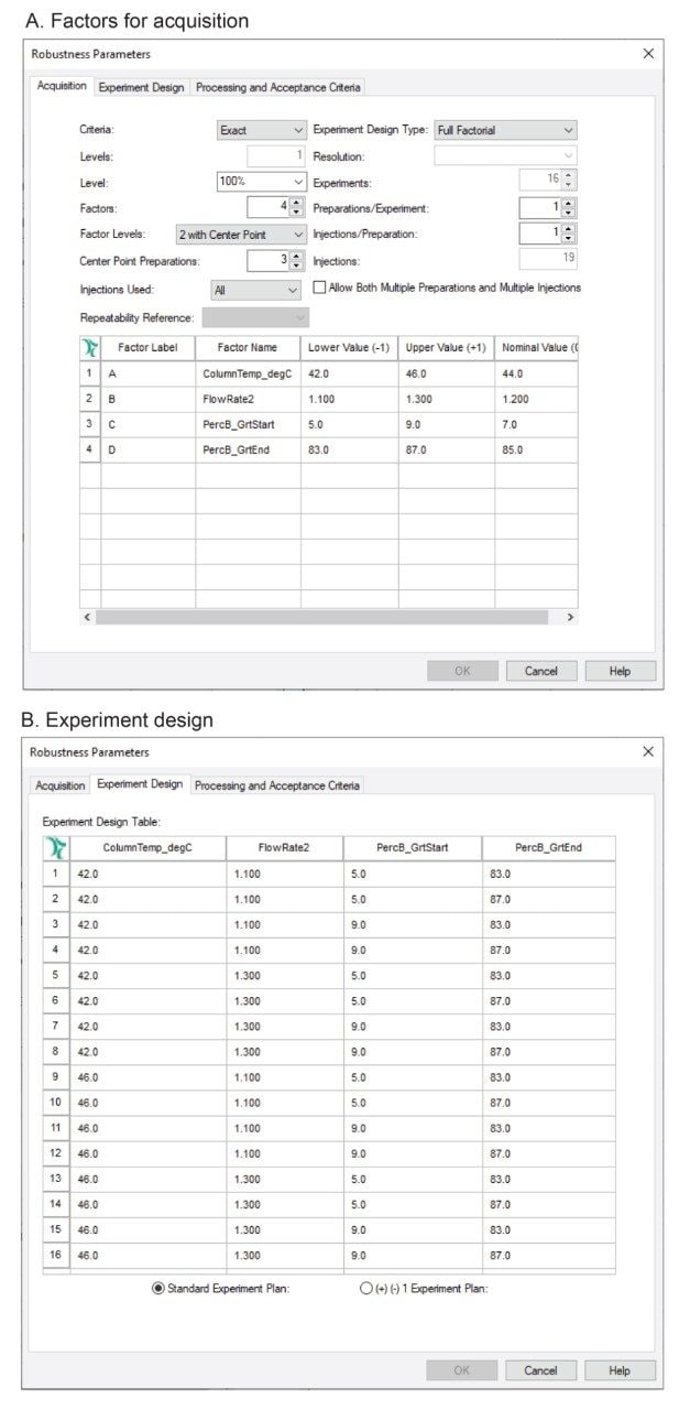 Figure 2. Setting up Empower MVM Software for robustness study. User defines the selection of study factors for acquisition (A) and Empower automatically creates the experiment design (B).