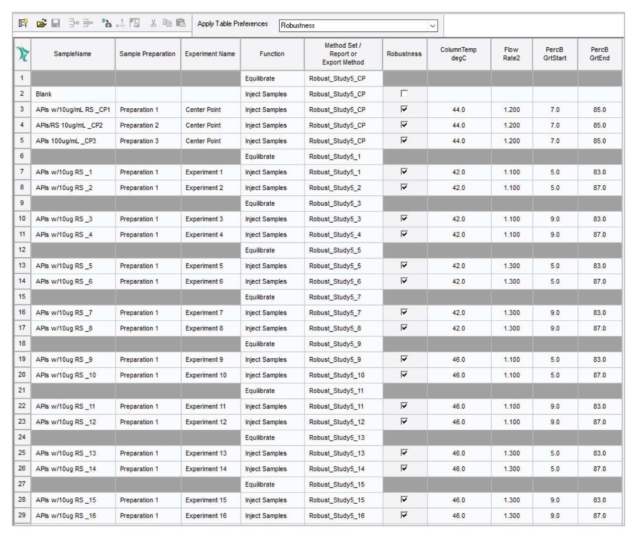 The chromatographic methods required to run the entire study were automatically created using Empower SSG Software. The Empower SSG automatically created a sample set method according to the experiment design as a ready-to-run injection sequence (Figure 3). The sample set method included the experiment name, and method sets with instruments methods for each experiment. Injections of blank and equilibration steps throughout the run were included as instructed by the user.