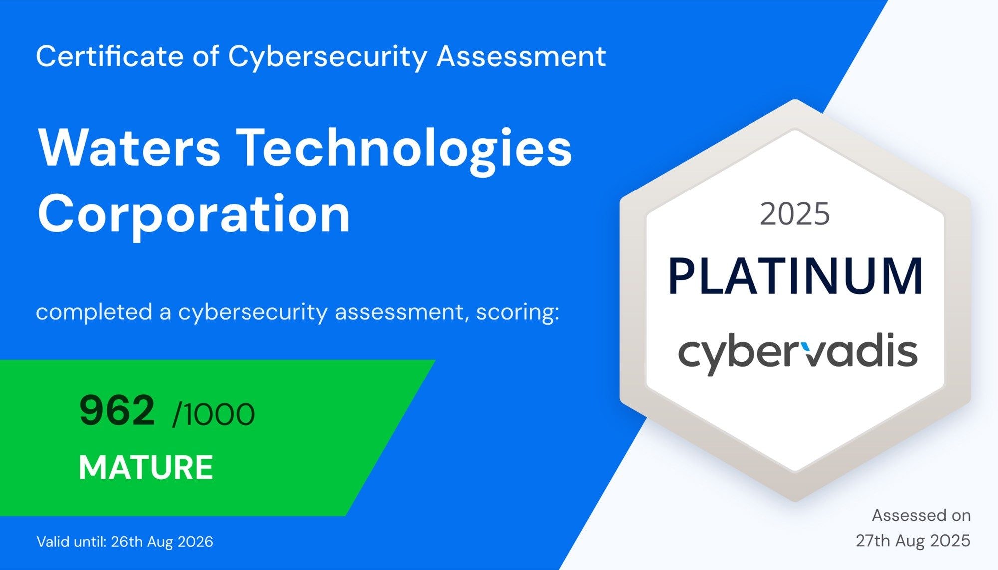 In addition to achieving this certification, Waters have also undergone a third-party risk assessment with CyberVadis, a leader in cybersecurity which focuses on 20 topics (such as Data Privacy, Access Management, and Infrastructure Security). Waters received a platinum medal and an overall rating of "mature" from our assessment in August 2025.