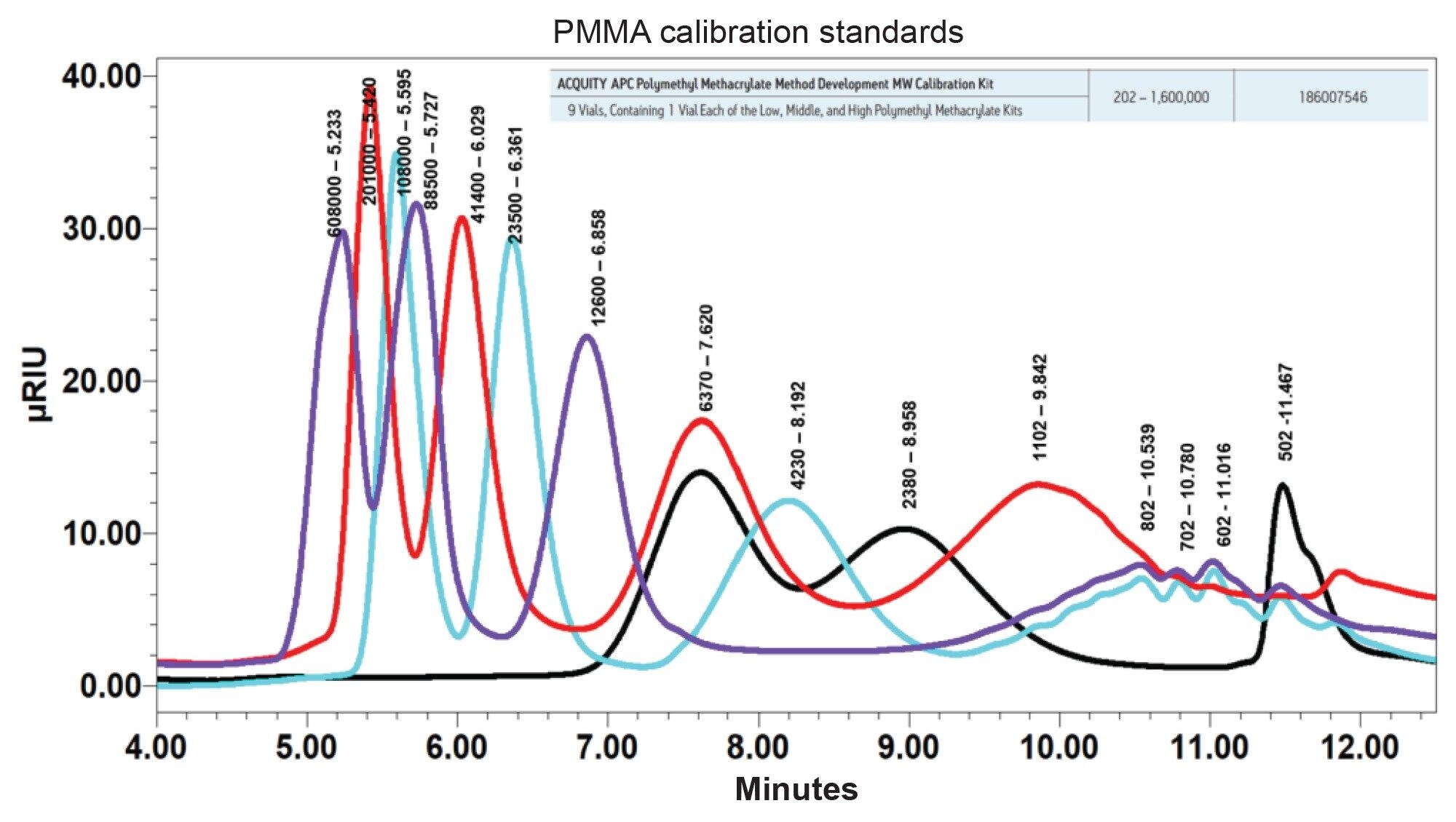 Once the column bank and method are optimized to 15 minutes per injection, the polymethyl methacrylate (PMMA) calibration standards are run to establish a range of molecular weight range in Figure 2 and relative calibration curve (Figure 3).9