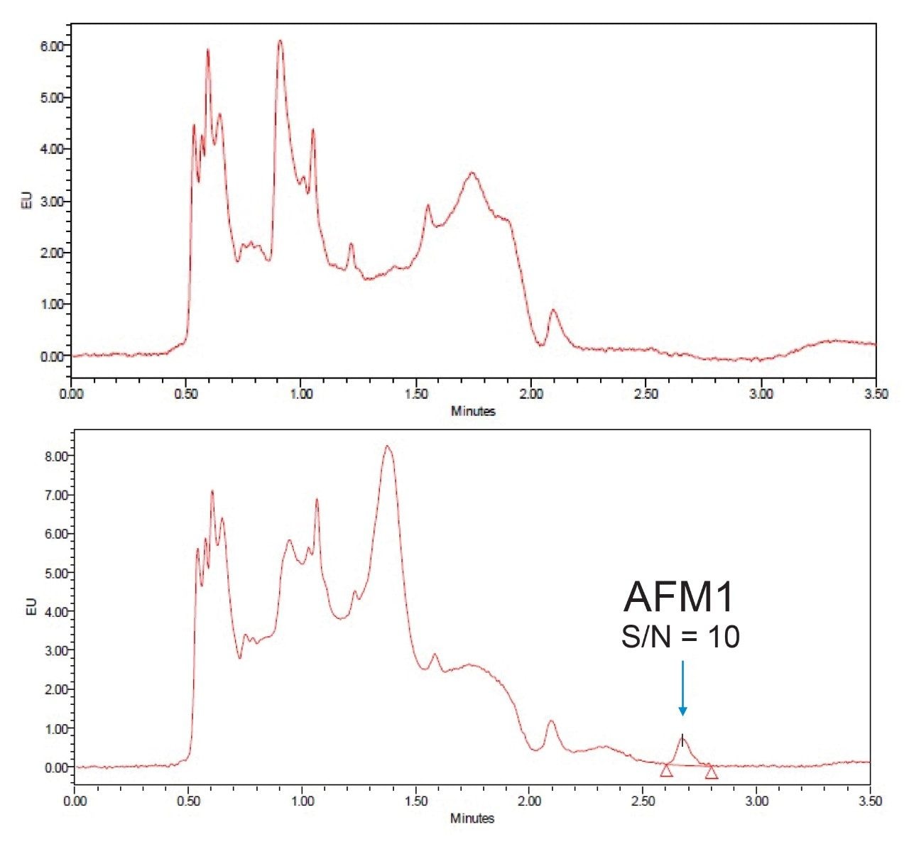 UPLC chromatograms from analysis of milk before (above) and after spiking with 0.005 µg/kg AFM1 (below).