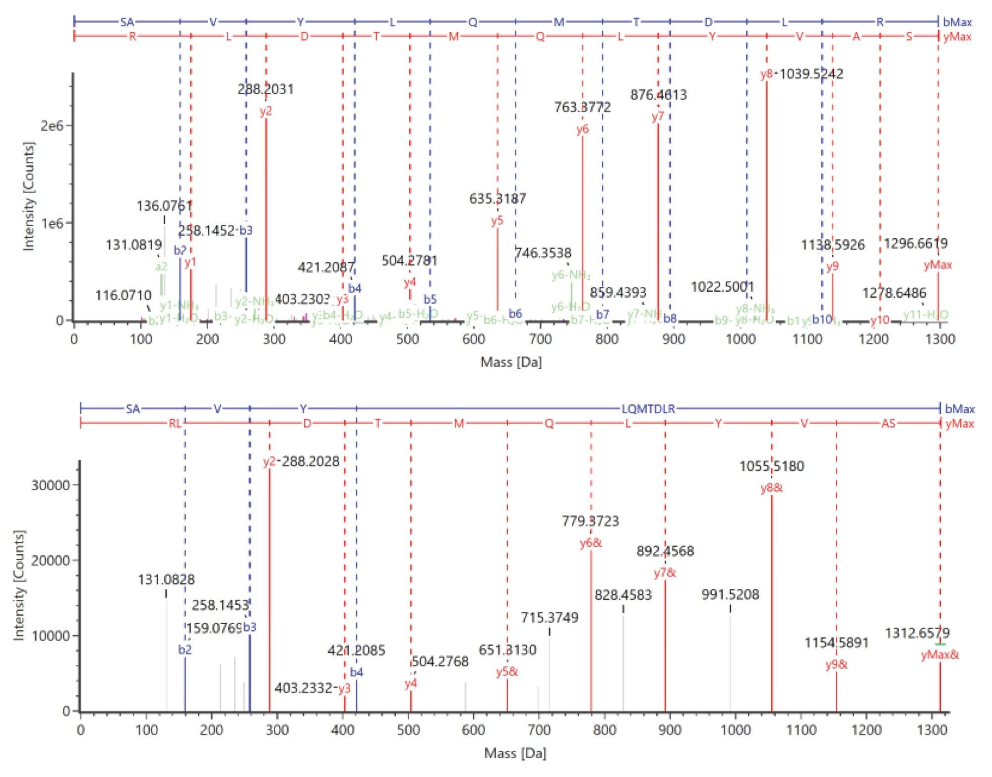 Figure 3. High energy MSE spectra of HT11 peptide in its (top) unmodified form and (bottom) oxidized form.