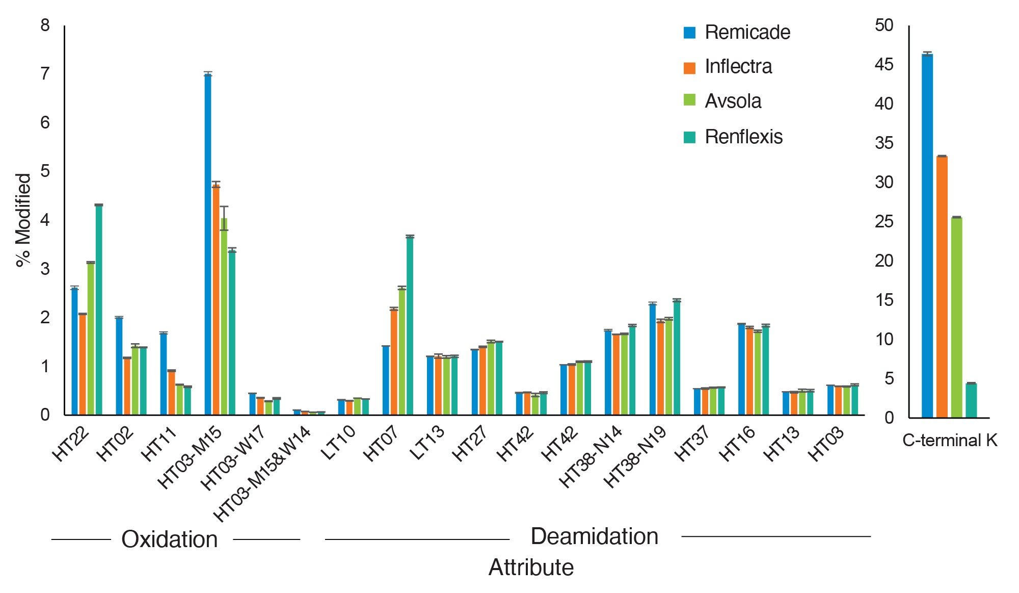 The quantification results for oxidized and deamidated peptides, as well as C-terminal lysine conjugation, are shown in Figure 6. All six of the oxidation sites monitored showed discernable differences between the infliximab products. For example, heavy chain tryptic peptide (HT) 02, HT11, and one of the sites on HT03 showed greater percentage of oxidation in the innovator, while HT22 showed greater percentage oxidation in two of the biosimilars, Avsola and Renflexis.