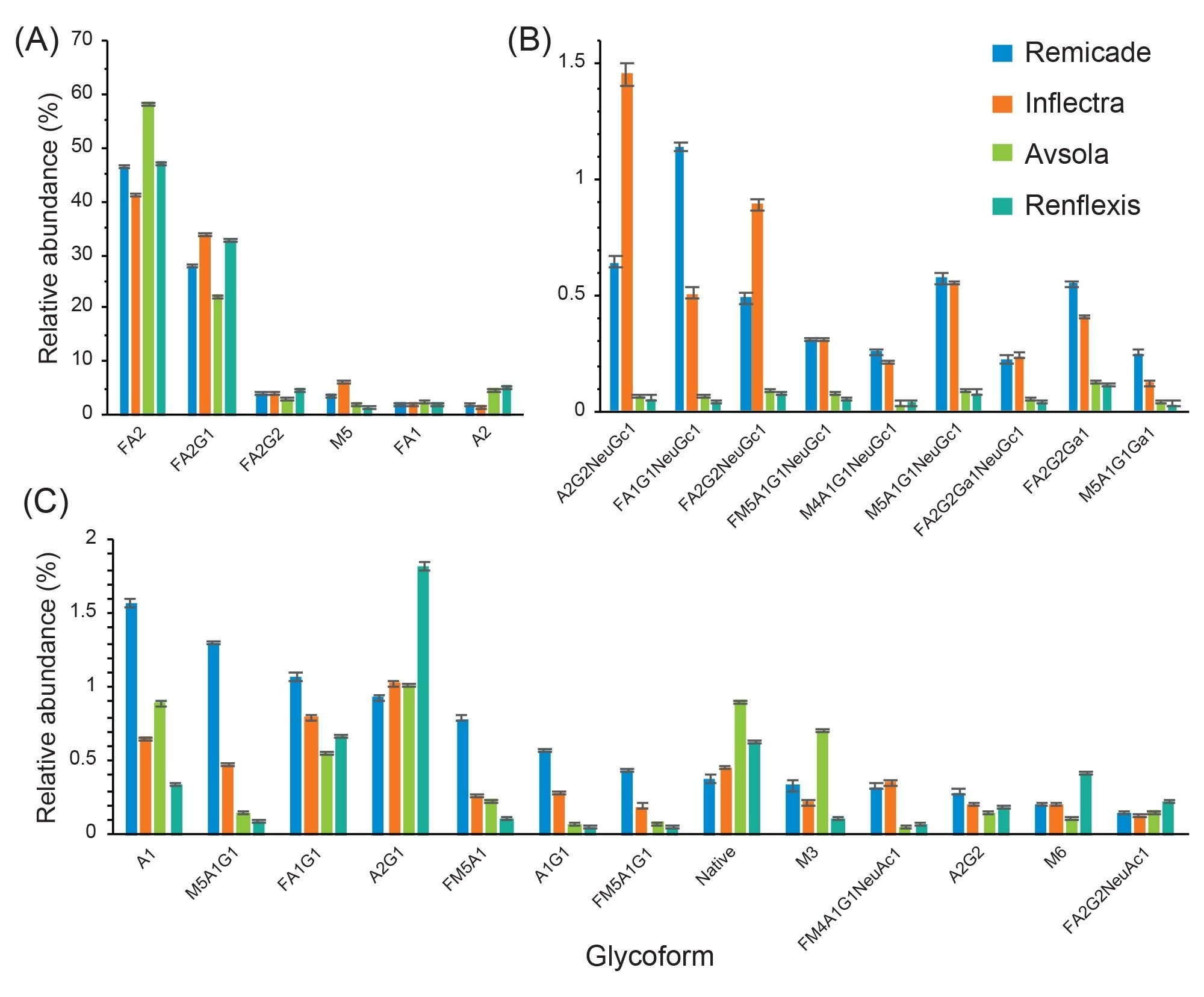 The immunogenic glycoforms were in greater abundance in Remicade and Inflectra compared to Avsola and Renflexis, as is expected due to the difference in cell lines, with the former originating from murine cell lines and the latter from Chinese hamster ovary cell lines.