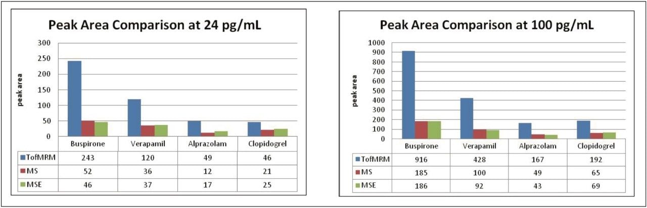 Figure 4. Plot of peak areas at 24 pg/mL (left) and 100 pg/mL (right), with data acquired using MS, MS,E and Tof-MRM modes.