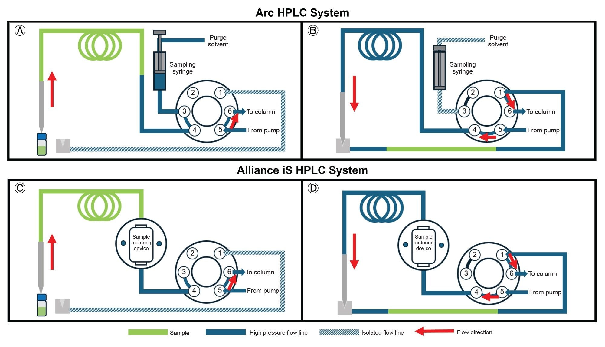 The HPLC systems in this study use different mechanisms for sample aspiration: sampling syringes and metering devices (Table 1). To illustrate differences between the mechanisms, Aspirate/Inject stages are depicted in Figure 1. For a sampling syringe design, which the Arc HPLC System uses, a low-pressure syringe aspirates the sample (Figure 1A). When the sample is injected (Figure 1B), the syringe is isolated from the high-pressure flow path, which may accumulate air over the course of a run.