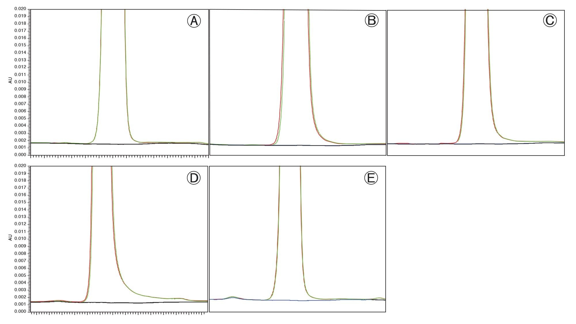 The assay was more challenging for the Alliance e2695 System, which showed higher peak area %RSD values (from 0.10% to 0.43%) compared to other systems. This is likely due to the low injection volume of the assay (6.6 µL). In default configuration, the Alliance e2695 System uses a 250 µL sampling syringe. The large volume of the sampling syringe paired with the low injection volume would contribute to a loss in precision and higher peak area %RSDs.
